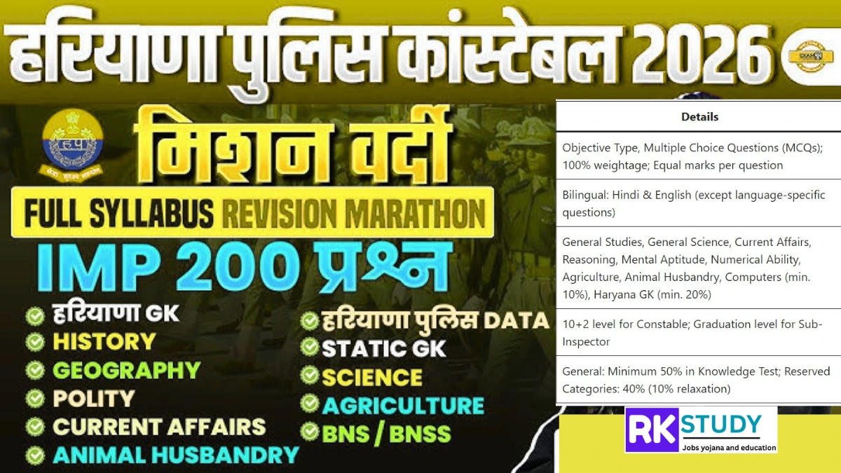 हरियाणा पुलिस कांस्टेबल (Haryana Police Constable) की परीक्षा राज्य के युवाओं के लिए एक सुनहरा अवसर है। हर साल लाखों अभ्यर्थी इस परीक्षा में शामिल होते हैं, लेकिन सफलता उन्हीं को मिलती है जो पाठ्यक्रम (syllabus) और परीक्षा पैटर्न को पूरी तरह समझते हैं। इस लेख में हम हरियाणा पुलिस कांस्टेबल भर्ती परीक्षा 2026 के संशोधित सिलेबस, विषयवार प्रश्नों की संख्या, शारीरिक मानक, और प्रभावी तैयारी के टिप्स पर विस्तार से चर्चा करेंगे।