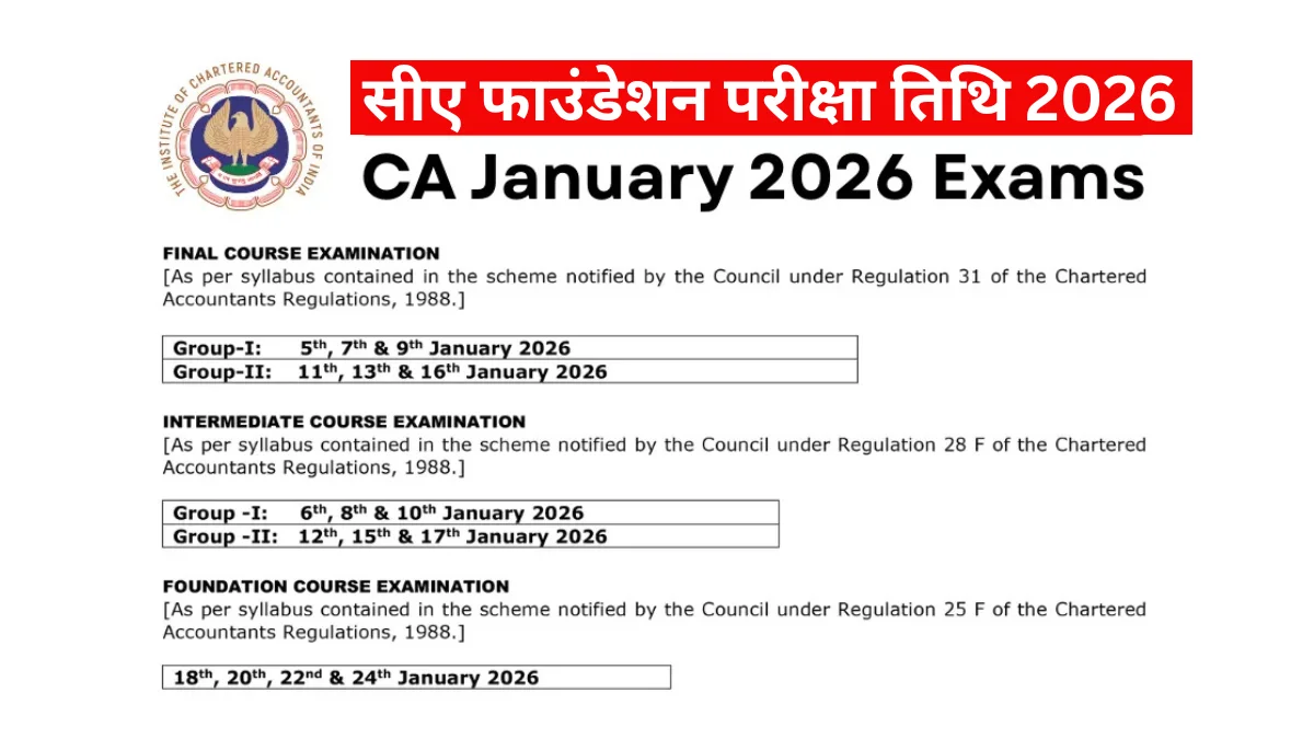 भारतीय चार्टर्ड एकाउंटेंट्स संस्थान (ICAI) ने चार्टर्ड अकाउंटेंसी पाठ्यक्रम की जनवरी 2026 सत्र की परीक्षाओं का कार्यक्रम जारी कर दिया है। इस कार्यक्रम में सीए फाउंडेशन, इंटरमीडिएट और फाइनल सभी स्तरों की परीक्षा तिथियां शामिल हैं।
