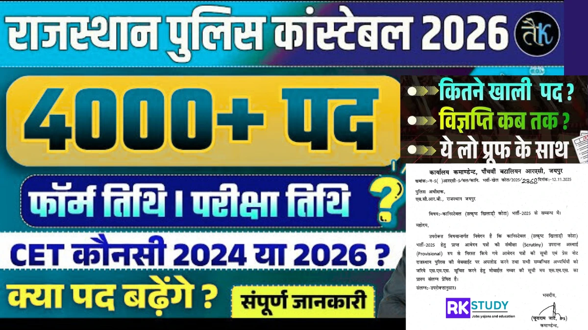 राजस्थान पुलिस में सरकारी नौकरी की चाह रखने वाले युवाओं के लिए एक बड़ी खबर है। राजस्थान पुलिस विभाग वर्ष 2026 में कांस्टेबल पदों पर बड़े पैमाने पर भर्ती करने जा रहा है। उपलब्ध जानकारी के अनुसार, इस भर्ती अभियान के तहत लगभग 4319 रिक्त पदों को भरा जाएगा। यह उन उम्मीदवारों के लिए एक शानदार अवसर है जिन्होंने 12वीं कक्षा उत्तीर्ण की है और राजस्थान कॉमन एलिजिबिलिटी टेस्ट (CET) 12वीं स्तर की परीक्षा में शामिल हुए हैं।